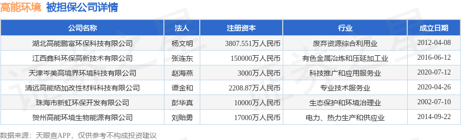 高能环境9月23日披露6笔对外担保,被担保公司6家。对外担保明细如下表:
