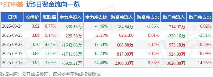 证券之星消息,截至2025年9月24日收盘,*ST中基(000972)报收于3.92元,上涨0.77%,换手率3.91%,成交量30.13万手,成交额1.19亿元。