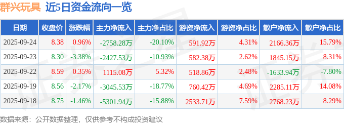 证券之星消息,截至2025年9月24日收盘,群兴玩具(002575)报收于8.38元,上涨0.96%,换手率2.78%,成交量16.44万手,成交额1.37亿元。