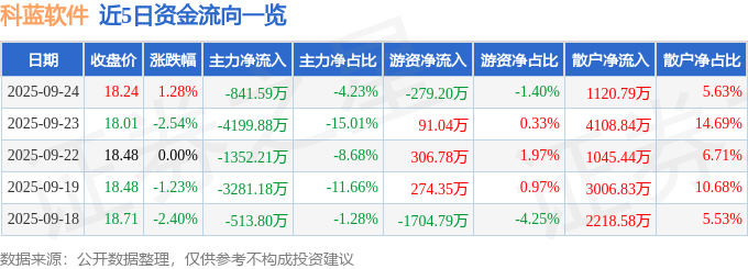 证券之星消息,截至2025年9月24日收盘,科蓝软件(300663)报收于18.24元,上涨1.28%,换手率2.46%,成交量11.0万手,成交额1.99亿元。