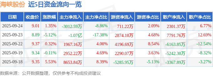 证券之星消息,截至2025年9月24日收盘,海峡股份(002320)报收于9.01元,上涨1.35%,换手率1.7%,成交量37.94万手,成交额3.4亿元。