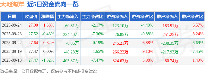 证券之星消息,截至2025年9月24日收盘,大地海洋(301068)报收于27.9元,上涨1.38%,换手率1.0%,成交量1.01万手,成交额2800.04万元。