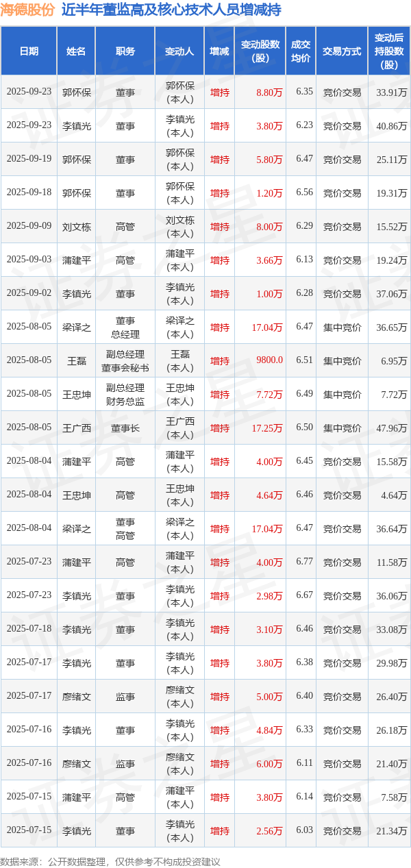 海德股份近半年内的董监高及核心技术人员增减持详情如下: