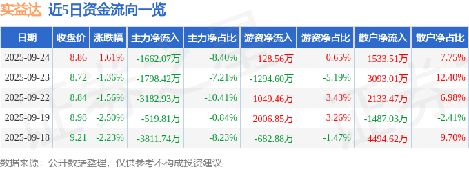 证券之星消息,截至2025年9月24日收盘,实益达(002137)报收于8.86元,上涨1.61%,换手率5.7%,成交量22.61万手,成交额1.98亿元。