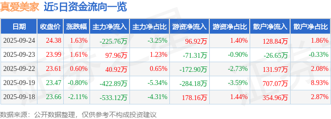 证券之星消息,截至2025年9月24日收盘,真爱美家(003041)报收于24.38元,上涨1.63%,换手率2.09%,成交量2.86万手,成交额6938.54万元。