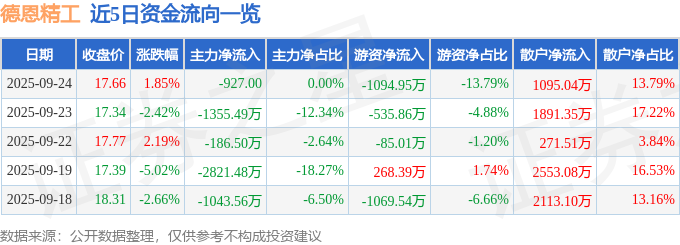证券之星消息,截至2025年9月24日收盘,德恩精工(300780)报收于17.66元,上涨1.85%,换手率4.22%,成交量4.54万手,成交额7940.98万元。