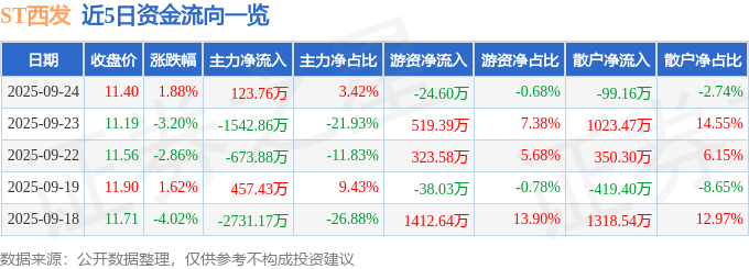 证券之星消息,截至2025年9月24日收盘,ST西发(000752)报收于11.4元,上涨1.88%,换手率1.21%,成交量3.2万手,成交额3620.37万元。