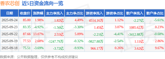 9月24日的资金流向数据方面,主力资金净流入1.82亿元,占总成交额4.49%,游资资金净流入4514.16万元,占总成交额1.12%,散户资金净流出2.27亿元,占总成交额5.61%。