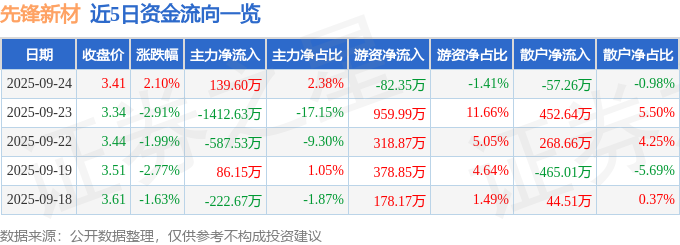 证券之星消息,截至2025年9月24日收盘,先锋新材(300163)报收于3.41元,上涨2.1%,换手率3.81%,成交量17.28万手,成交额5853.99万元。