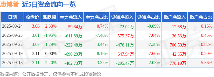 证券之星消息,截至2025年9月24日收盘,惠博普(002554)报收于3.08元,上涨2.33%,换手率1.98%,成交量26.39万手,成交额8066.14万元。