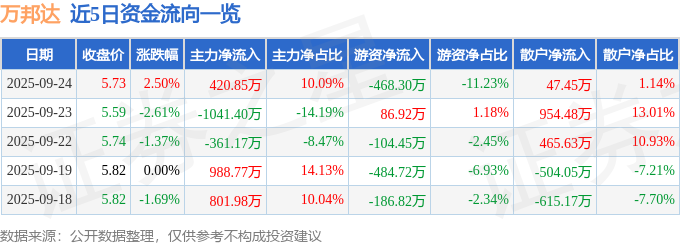 证券之星消息,截至2025年9月24日收盘,万邦达(300055)报收于5.73元,上涨2.5%,换手率1.16%,成交量7.36万手,成交额4169.89万元。