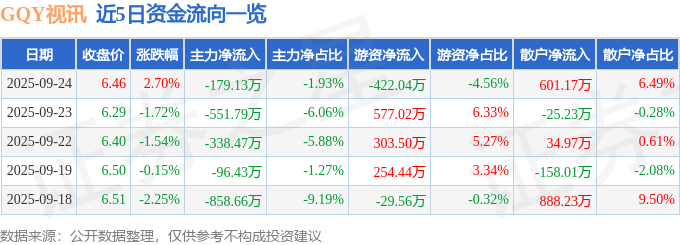 证券之星消息,截至2025年9月24日收盘,GQY视讯(300076)报收于6.46元,上涨2.7%,换手率3.41%,成交量14.47万手,成交额9258.12万元。
