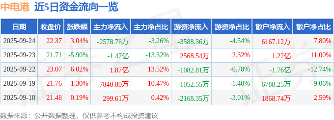证券之星消息,截至2025年9月24日收盘,中电港(001287)报收于22.37元,上涨3.04%,换手率8.21%,成交量35.92万手,成交额7.91亿元。