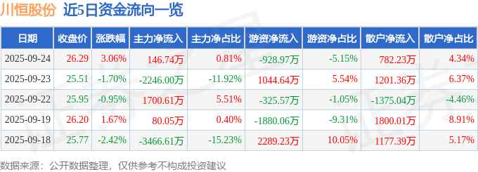 证券之星消息,截至2025年9月24日收盘,川恒股份(002895)报收于26.29元,上涨3.06%,换手率1.17%,成交量6.96万手,成交额1.8亿元。