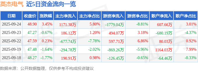 证券之星消息,截至2025年9月24日收盘,英杰电气(300820)报收于48.9元,上涨3.45%,换手率3.74%,成交量4.16万手,成交额2.02亿元。