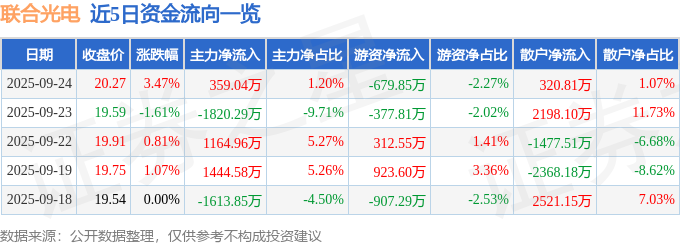 证券之星消息,截至2025年9月24日收盘,联合光电(300691)报收于20.27元,上涨3.47%,换手率6.79%,成交量14.98万手,成交额2.99亿元。