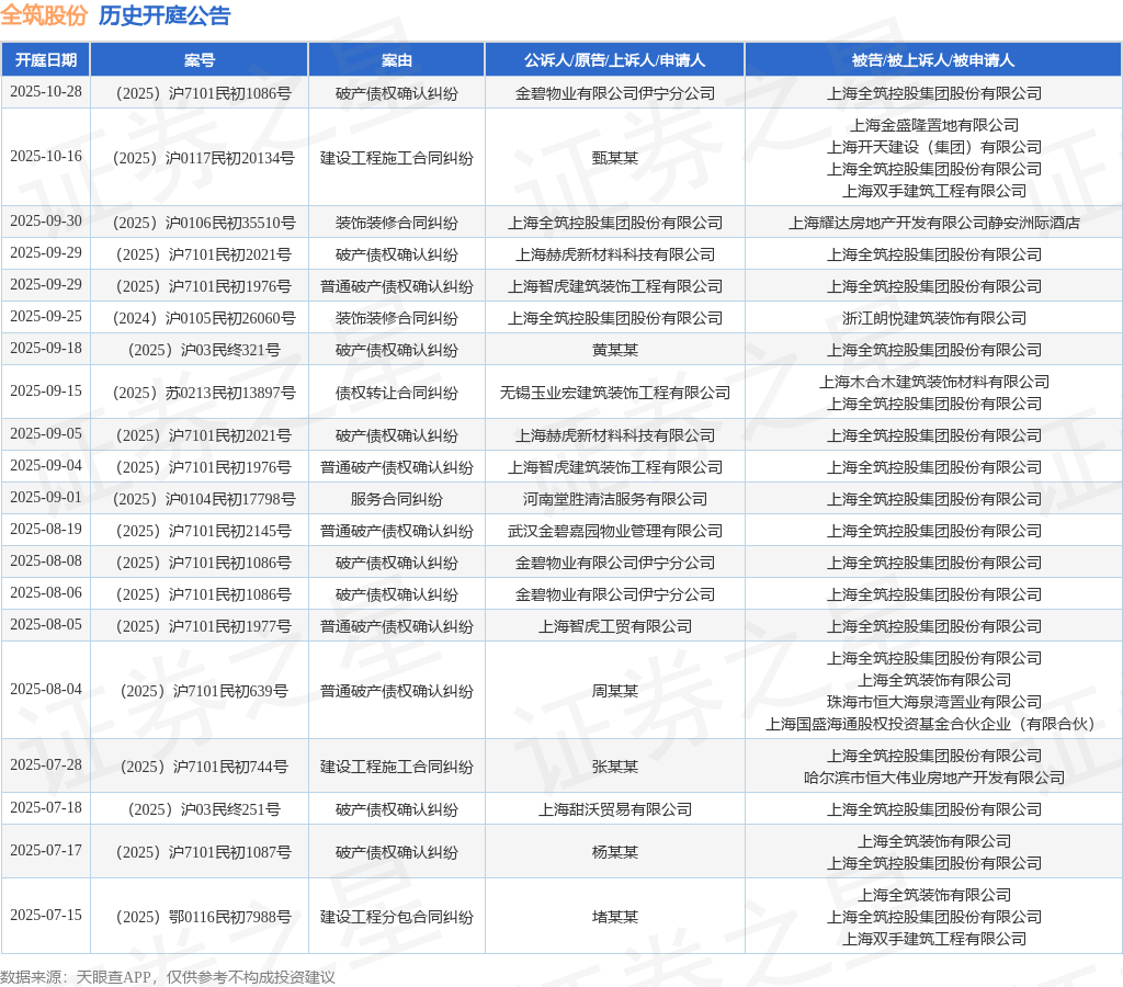 证券之星消息,根据天眼查APP显示,近日公布了一则上海全筑控股集团股份有限公司作为原告/上诉人的开庭公告,详细内容如下: