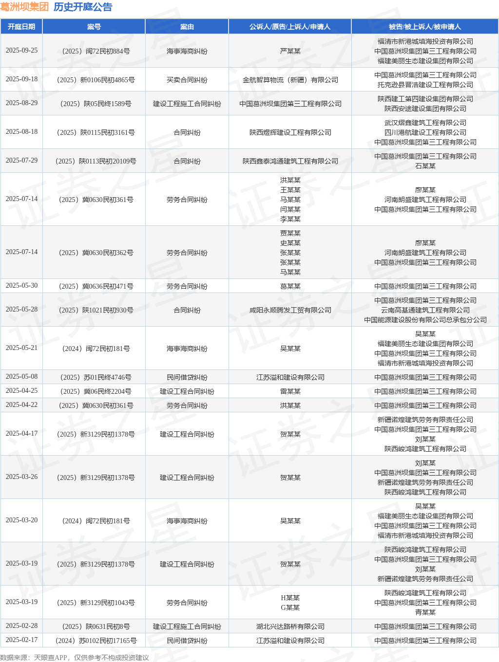 案号:(2025)闽72民初884号根据统计,近一年内以中国葛洲坝集团第三工程有限公司为当事人的历史开庭公告有27则,其中案由为“劳务合同纠纷”的公告以5则居首,其次为“合同纠纷”有5则,“建设工程合同纠纷”有4则。历史开庭公告(前20条)如下: