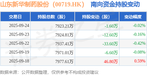 证券之星消息,9月24日南向资金减持1.6万股山东新华制药股份(00719.HK)。近5个交易日中,获南向资金减持的有4天,累计净减持7.6万股。近20个交易日中,获南向资金减持的有16天,累计净减持284.26万股。截至目前,南向资金持有山东新华制药股份(00719.HK)7923.21万股,占公司已发行普通股的40.63%。
