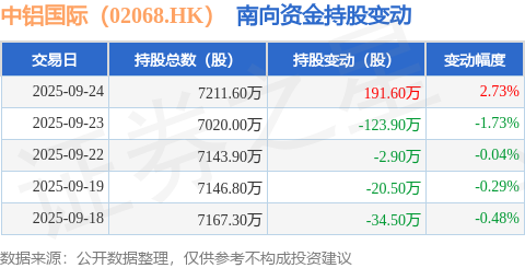 证券之星消息,9月24日南向资金增持191.6万股中铝国际(02068.HK)。近5个交易日中,获南向资金增持的有1天,累计净增持9.8万股。近20个交易日中,获南向资金增持的有9天,累计净增持9.5万股。截至目前,南向资金持有中铝国际(02068.HK)7211.6万股,占公司已发行普通股的18.05%。