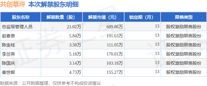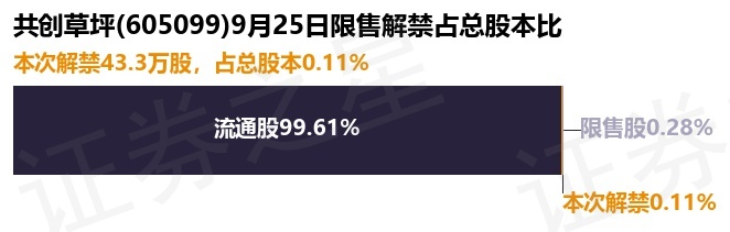 证券之星消息,根据市场公开信息整理,共创草坪(605099)于9月25日将有43.3万股限售股份解禁,为公司股权激励限售股份,占公司总股本0.11%。(本次数据根据历史公告整理得出,实际情况以上市公司最新公告为准)本次解禁后,公司还有111.82万股限售股份,占总股本0.28%。具体如下图所示: