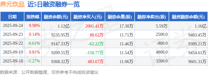 养元饮品融资融券信息显示,融资方面,当日融资买入5132.58万元,融资偿还3131.16万元,融资净买入2001.41万元。融券方面,融券卖出6.2万股,融券偿还6100.0股,融券余量17.3万股,融券余额402.18万元。融资融券余额1.16亿元。