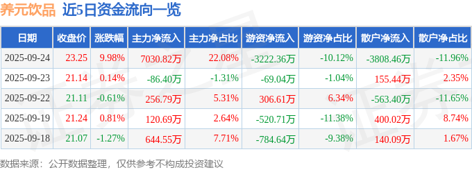 证券之星消息,截至2025年9月24日收盘,养元饮品(603156)报收于23.25元,上涨9.98%,涨停,换手率1.12%,成交量14.1万手,成交额3.18亿元。