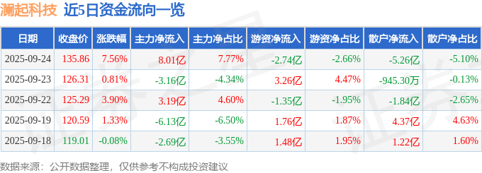 9月24日的资金流向数据方面,主力资金净流入8.01亿元,占总成交额7.77%,游资资金净流出2.74亿元,占总成交额2.66%,散户资金净流出5.26亿元,占总成交额5.1%。