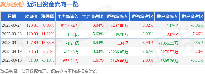 证券之星消息,截至2025年9月24日收盘,聚辰股份(688123)报收于128.31元,上涨6.93%,换手率13.4%,成交量21.2万手,成交额27.05亿元。