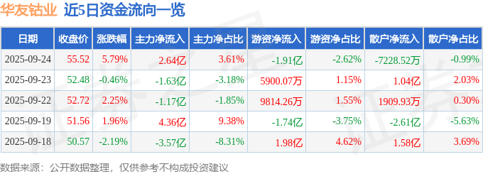 证券之星消息,截至2025年9月24日收盘,华友钴业(603799)报收于55.52元,上涨5.79%,换手率7.23%,成交量132.32万手,成交额72.97亿元。
