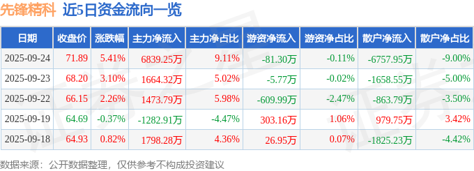 证券之星消息,截至2025年9月24日收盘,先锋精科(688605)报收于71.89元,上涨5.41%,换手率25.83%,成交量10.46万手,成交额7.51亿元。
