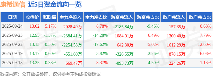 证券之星消息,截至2025年9月24日收盘,康希通信(688653)报收于13.62元,上涨5.17%,换手率5.53%,成交量17.17万手,成交额2.31亿元。