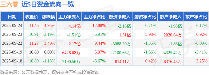 证券之星消息,截至2025年9月24日收盘,三六零(601360)报收于11.45元,上涨4.95%,换手率4.04%,成交量283.06万手,成交额32.16亿元。