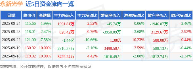 证券之星消息,截至2025年9月24日收盘,永新光学(603297)报收于115.66元,下跌1.99%,换手率6.22%,成交量6.89万手,成交额7.91亿元。
