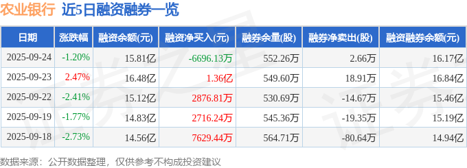 农业银行融资融券信息显示,融资方面,当日融资买入4.39亿元,融资偿还5.06亿元,融资净偿还6696.13万元。融券方面,融券卖出21.74万股,融券偿还19.08万股,融券余量552.26万股,融券余额3628.35万元。融资融券余额16.17亿元。