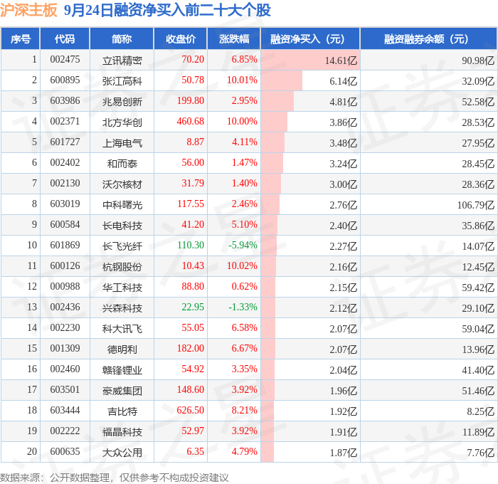 沪深主板融资净买入前三分别为:立讯精密(002475)融资净买入14.61亿元、张江高科(600895)融资净买入6.14亿元、兆易创新(603986)融资净买入4.81亿元,前20具体见下表: