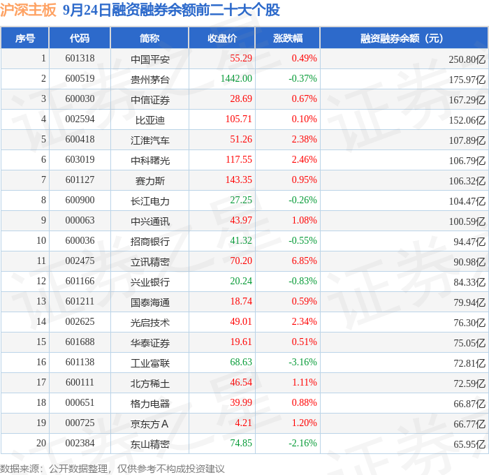 沪深主板融资融券余额前三分别为:中国平安(601318)融资融券余额250.8亿元、贵州茅台(600519)融资融券余额175.97亿元、中信证券(600030)融资融券余额167.29亿元,前20具体见下表: