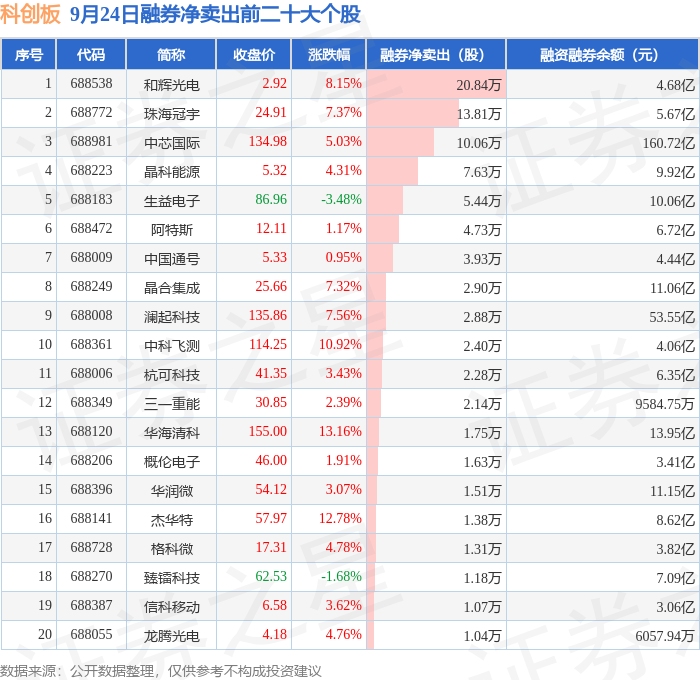 科创板融券净卖出前三分别为:和辉光电(688538)融券净卖出20.84万股、珠海冠宇(688772)融券净卖出13.81万股、中芯国际(688981)融券净卖出10.06万股,前20具体见下表: