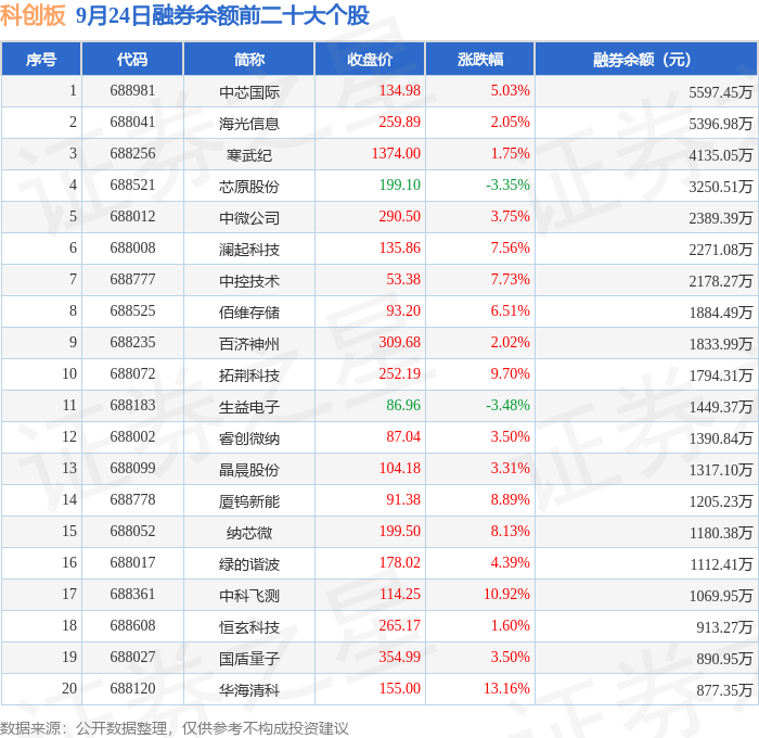 科创板融券余额前三分别为:中芯国际(688981)融券余额5597.45万元、海光信息(688041)融券余额5396.98万元、寒武纪(688256)融券余额4135.05万元,前20具体见下表: