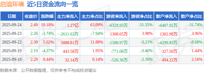 证券之星消息,截至2025年9月24日收盘,启迪环境(000826)报收于2.49元,上涨10.18%,涨停,换手率5.69%,成交量81.12万手,成交额2.02亿元。