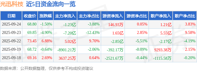 证券之星消息,截至2025年9月24日收盘,光迅科技(002281)报收于68.8元,下跌1.5%,换手率5.94%,成交量46.3万手,成交额31.61亿元。