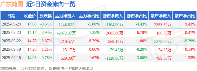 9月24日的资金流向数据方面,主力资金净流出1248.62万元,占总成交额5.0%,游资资金净流出1104.9万元,占总成交额4.43%,散户资金净流入2353.52万元,占总成交额9.43%。