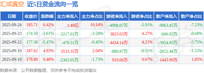 证券之星消息,截至2025年9月24日收盘,汇成真空(301392)报收于185.71元,上涨6.42%,换手率18.61%,成交量7.59万手,成交额13.78亿元。