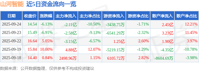 证券之星消息,截至2025年9月24日收盘,山河智能(002097)报收于14.54元,下跌6.13%,换手率12.68%,成交量136.02万手,成交额20.09亿元。