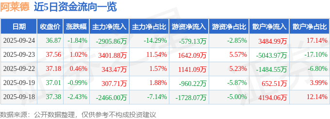 证券之星消息,截至2025年9月24日收盘,阿莱德(301419)报收于36.87元,下跌1.84%,换手率13.09%,成交量5.55万手,成交额2.03亿元。