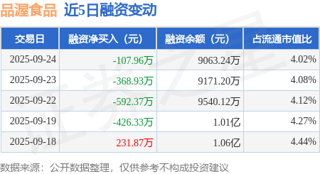证券之星消息,9月24日,品渥食品(300892)融资买入875.96万元,融资偿还983.92万元,融资净卖出107.96万元,融资余额9063.24万元。