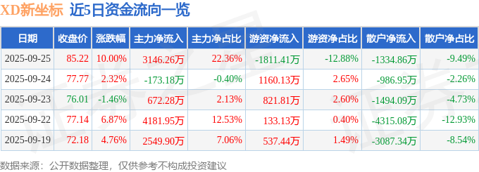 证券之星消息,截至2025年9月25日收盘,XD新坐标(603040)报收于85.22元,上涨10.0%,涨停,换手率1.23%,成交量1.68万手,成交额1.41亿元。