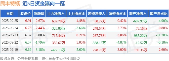 证券之星消息,截至2025年9月25日收盘,民丰特纸(600235)报收于6.91元,上涨2.67%,换手率5.85%,成交量20.57万手,成交额1.42亿元。