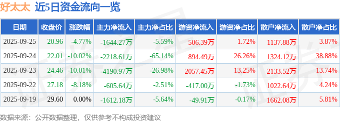 证券之星消息,截至2025年9月25日收盘,好太太(603848)报收于20.96元,下跌4.77%,换手率3.45%,成交量13.89万手,成交额2.94亿元。