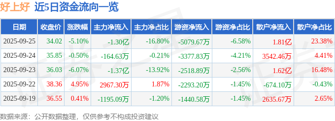证券之星消息,截至2025年9月25日收盘,好上好(001298)报收于34.02元,下跌5.1%,换手率14.55%,成交量22.41万手,成交额7.72亿元。